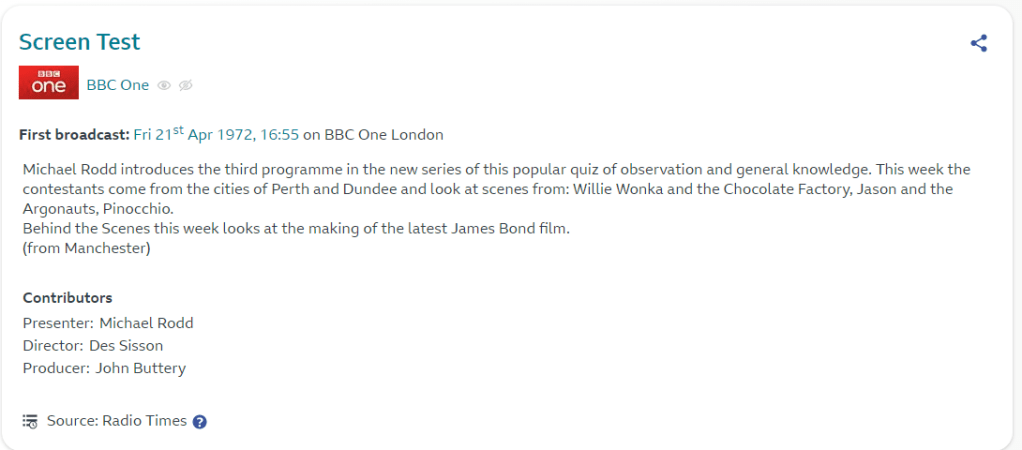 My first memory of Willy Wonka was on the small screen as a clip on the Screen Test programme. Thanks to the magic of the Radio Times Archive (with which I am becoming obsessed for its ability to take me back to my childhood days) I have pinpointed it to an episode that aired in 1972.