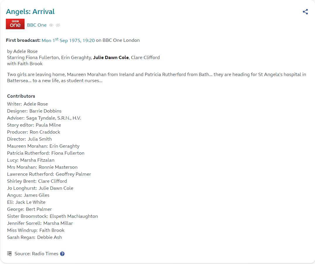 By this time, Julie Dawn Cole had become one of my early heart throbs and I nursed (pun intended) a huge crush on her when she appeared as Jo Longhurst in the hospital drama, Angels, which started in 1975. Julie’s were the first pictures I had up on my wall and when I watched Angels, any part of the story that didn’t include Jo saw my attention wandering!