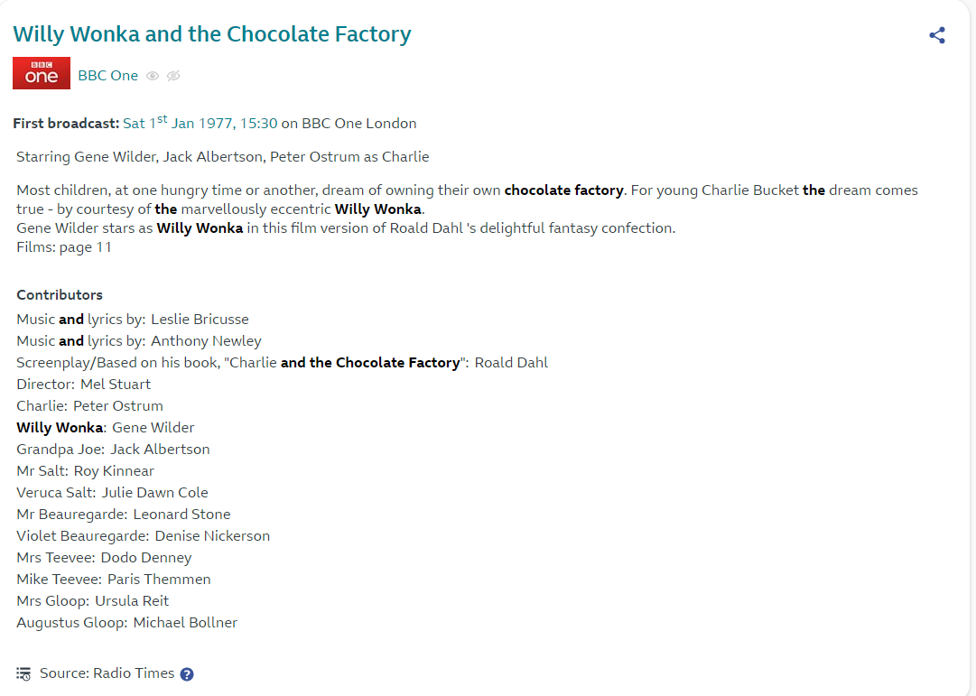 My first memory of Willy Wonka was on the small screen as a clip on the Screen Test programme. Thanks to the magic of the Radio Times Archive (with which I am becoming obsessed for its ability to take me back to my childhood days) I have pinpointed it to an episode that aired in 1972.
