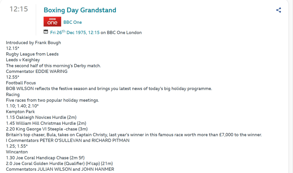 Boxing Day, rather like Christmas Eve seemed to be a case of keeping the children out of mischief, but perhaps this time to ensure that they didn’t wake up hungover and/or tired parents! To that end, there were cartoons like Boss Cat (as Top Cat was inexplicably called in the UK) and Hong Kong Phooey and an episode of Holiday Star Trek – not Christmas themed, just Star Trek shown during the holidays! Just after midday it was time for sport, and in those days sport meant only one thing – Grandstand!