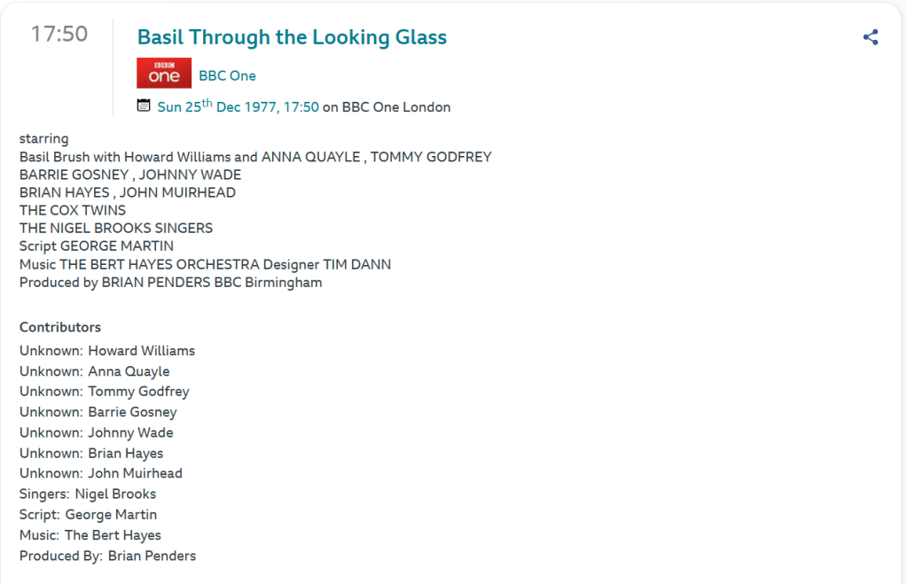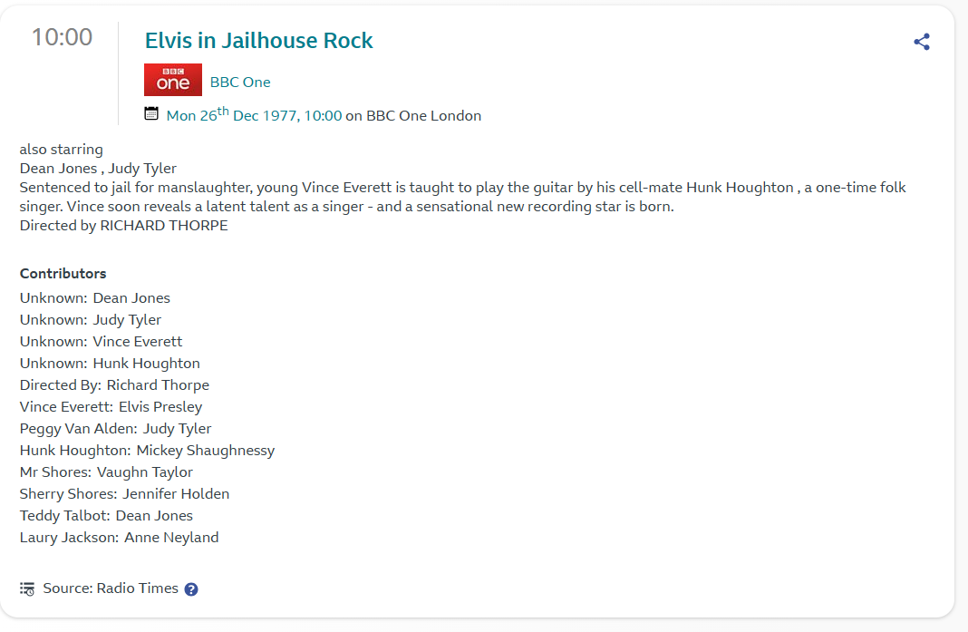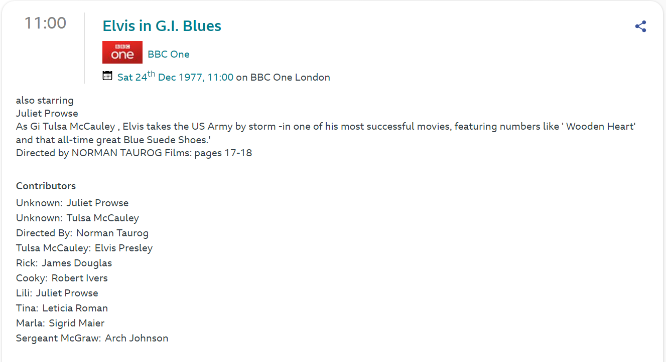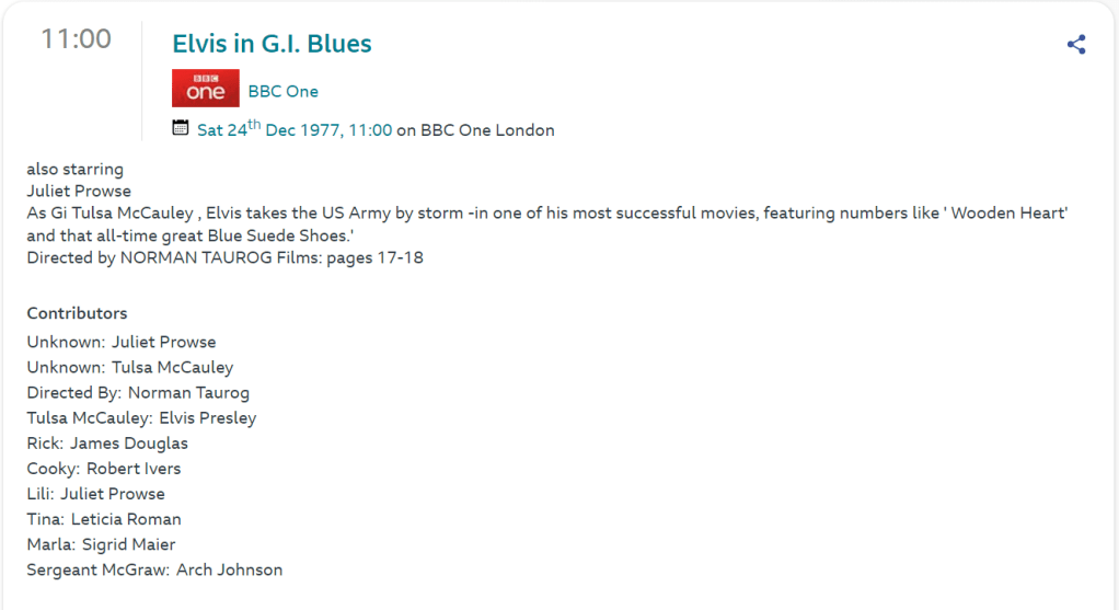 Following G.I. Blues your BBC1 viewing was eclectic to say the very least. At 12:40 there was the Soviet Gymnastics Spectacular, at 1:30 the film White Christmas and at 3:25 Jubilee 77 which looked back at the Queen’s Silver Jubilee celebrations that June. The two hours watching this review may, I would suggest, have stretched my 12 year old patience too far!