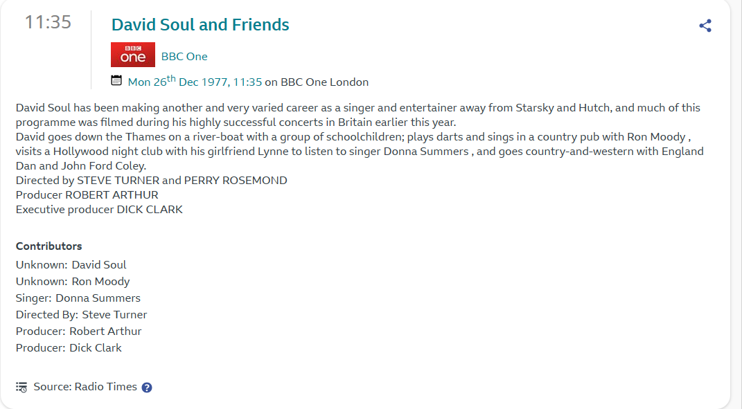 The double act of Fagin and Hutch takes some getting your head round, especially them taking part in a darts match! However, both were very adept at comedy as well as drama and they both had a background in music so perhaps it isn’t quite as surprising as it seems. Soul’s appearance in the Christmas schedules reflects what a huge star he had become on this side of the Atlantic due to Starsky and Hutch and his massively successful year in the upper reaches of the charts.