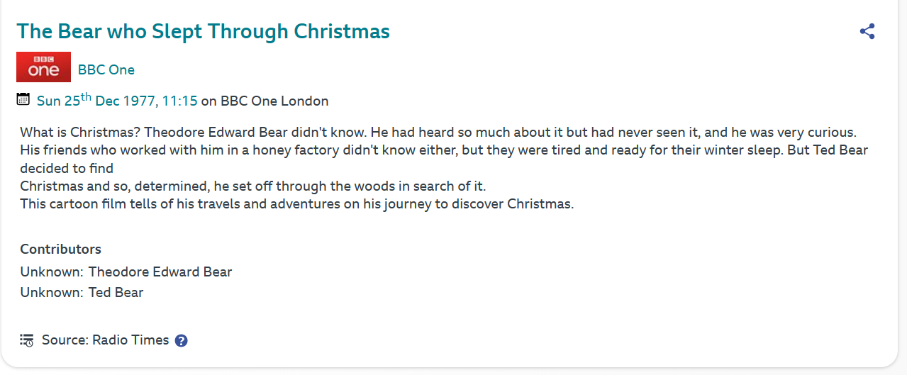 The morning offerings were similar to two years earlier with two programmes focused on the religious element of the season. Star over Bethlehem featured a service from the Church of the Nativity in Bethlehem, and after a programme called Playboard, which I have no recollection of at all, the traditional showing of a church service, this time from Kingston upon Thames in Surrey. The sole Christmas themed children’s programme was The Bear who Slept through Christmas.