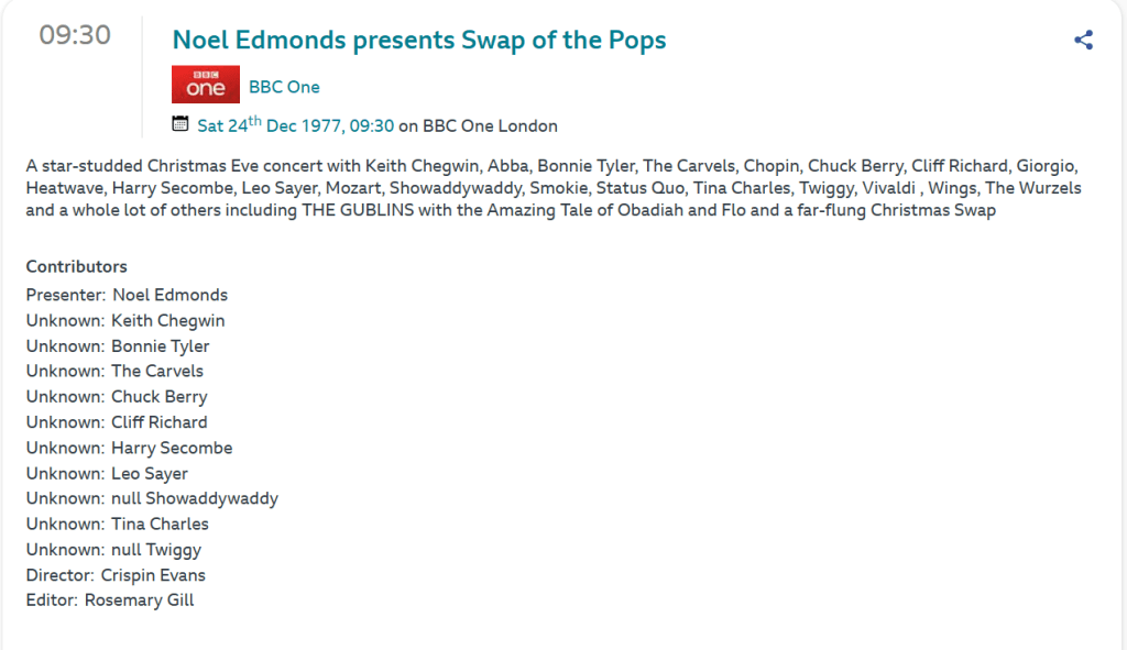 The Christmas Eve morning line up was very appealing to me at the time and, quite honestly, would be appealing to me now! We start off with Bagpuss at 8.55, which was a total comfort blanket of a programme. For a complete contrast you had that followed by Buster Crabbe in Flash Gordon Conquers the Universe from 1940, which was still exciting to watch given the amount of battles and the cliff-hangers that would take you into the next episode. Regardless of the slightly hammy quality of the acting, it definitely stood the test of time in those days. It would, perhaps, be less appealing to the majority of today’s 12 year olds, but even 80 years on, it’s relatively fast pace might keep some of them interested. The next 90 minutes would have been an absolute must see for me as it contained much of the music I would have bought as I started to collect singles. I was a Swap Shop fan through and through, never once switching channels to the anarchy of Tiswas, whose casual, if humorous, cruelty reminded me far too much of my days at school at the time, minus the humour of course. One of the main areas for the other children at school to target were my musical likes which I was occasionally unguarded enough to admit to. This programme gave me 90 minutes to ignore all the bullying and ridicule and just enjoy pop music in Swap of the Pops.