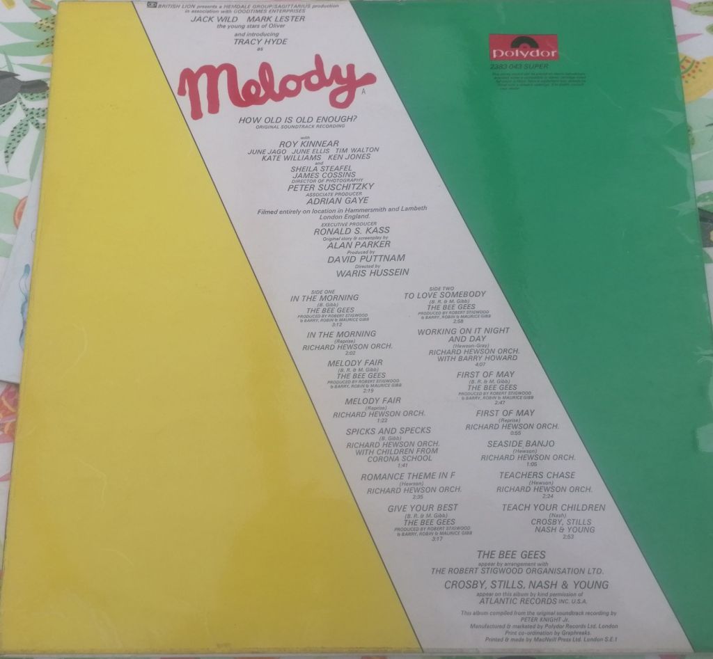 One of my favourite films from the 1970s is Melody (also known as SWALK on release in some countries). It stars Mark Lester and Jack Wild from Oliver and Tracy Hyde in her first film role. It tells the story of Daniel Latimer (Lester) who falls in love with Melody Perkins (Hyde), much to the bemusement and dismay of those around them. I got the soundtrack on CD, an import from Argentina, where the film was incredibly popular (as indeed it was in Japan), a number of years ago, but last year I hit the jackpot with a vinyl copy from a record shop in Bexhill, and as you know everything sounds better on vinyl! 😉😉 The soundtrack is absolutely central to the film, more so than usual, because the Bee Gees tracks, originally recorded in the 1960s by the group, informed the storyline and even the name of the titular character. In the film, the songs are as much a part of the charm of this underappreciated gem as the London locations of the 1970s, the authenticity of the grim school environment common at the time, and the acting of the children and adults alike.