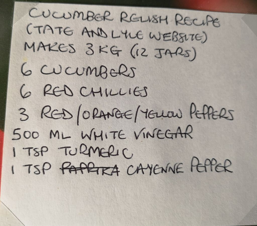 My favourite recipe is Cucumber Relish. Not for how it tastes, although it tastes amazing. Not for how easy it is to prepare and cook, although that gets easier every year. It’s my favourite because of what it represents.