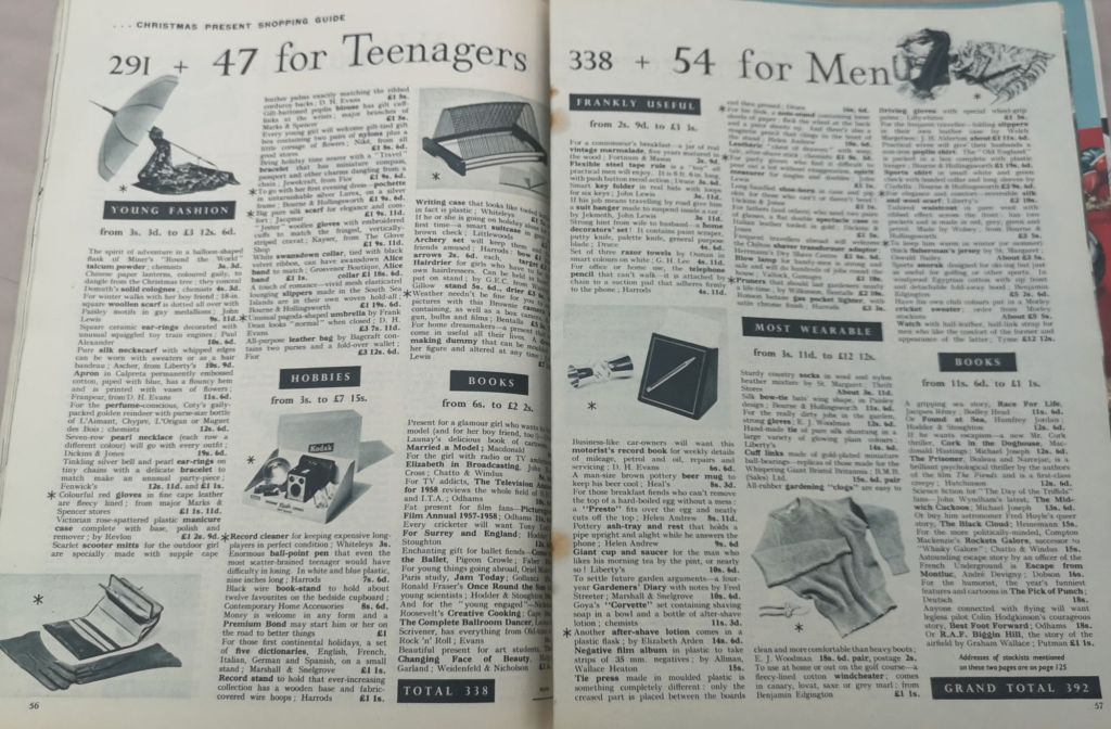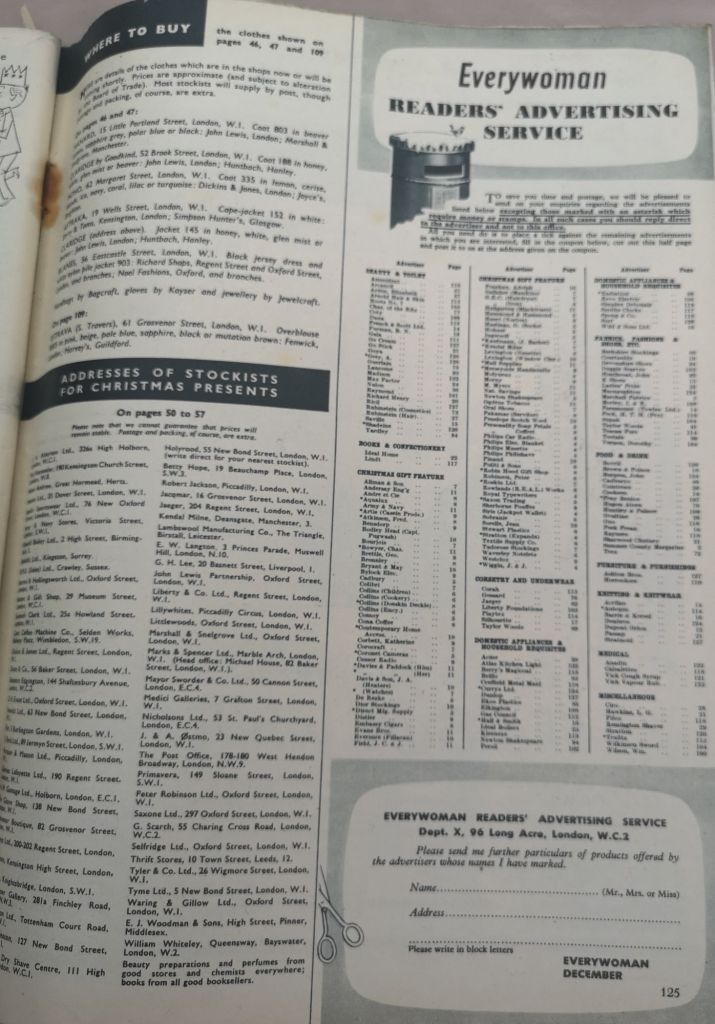 The encouragement for people to observe a traditional Christmas seems to be unnecessary by 1957, so the magazine can head straight into ideas for presents and it does so in no uncertain terms. Its 8 page Christmas shopping guide stretches to nearly 400 gifts. Not quite the Argos or Littlewoods catalogue of my childhood but near enough! Family giving focuses on the practical and useful, the type of gifts you may give to a relative. Then there’s over 100 gifts for children split along gender lines with toys for boys referencing polar and space exploration and for girls flower pots, aprons and a ‘miniature sink unit for the future housewife’! I was going to say that we have left those days behind, but I can imagine some who would happily bring back those dividing lines! Women would have recognised the types of gifts as being useful for the occasional night out, with the more practical items like cleaning appliances no longer suggested as appropriate presents. Teenagers were treated as their own group and some of the ideas like record cleaners and a set of five dictionaries for their first continental holidays certainly hinted at the more adventurous approach of that age group. For men, accessories like a home decorator’s set, motorist’s record book and a gardener’s diary hinted at the traditional pursuits while the clothes were generally about comfort rather than style in a time where the two piece suit was still leisure wear for many who could not stretch to a varied wardrobe. At the end of the magazine, as you will see below, there is a helpful list of all stockists and a coupon to request details for as few or as many advertisers as you wished.