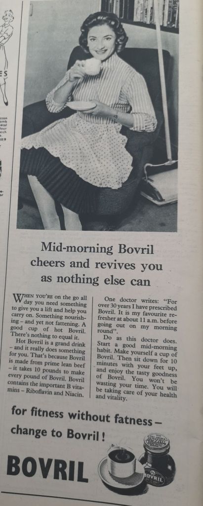 We have already looked at advertisements for presents, but there is one advert from Bovril that shows a very interesting development in the way some women saw themselves. In 1950, Bovril were extolling the virtue of their drink to help keep children strong and healthy. By 1957, they were marketing the drink as a slimming aid. Now that rationing by the government was over, women could choose to ration food for themselves!