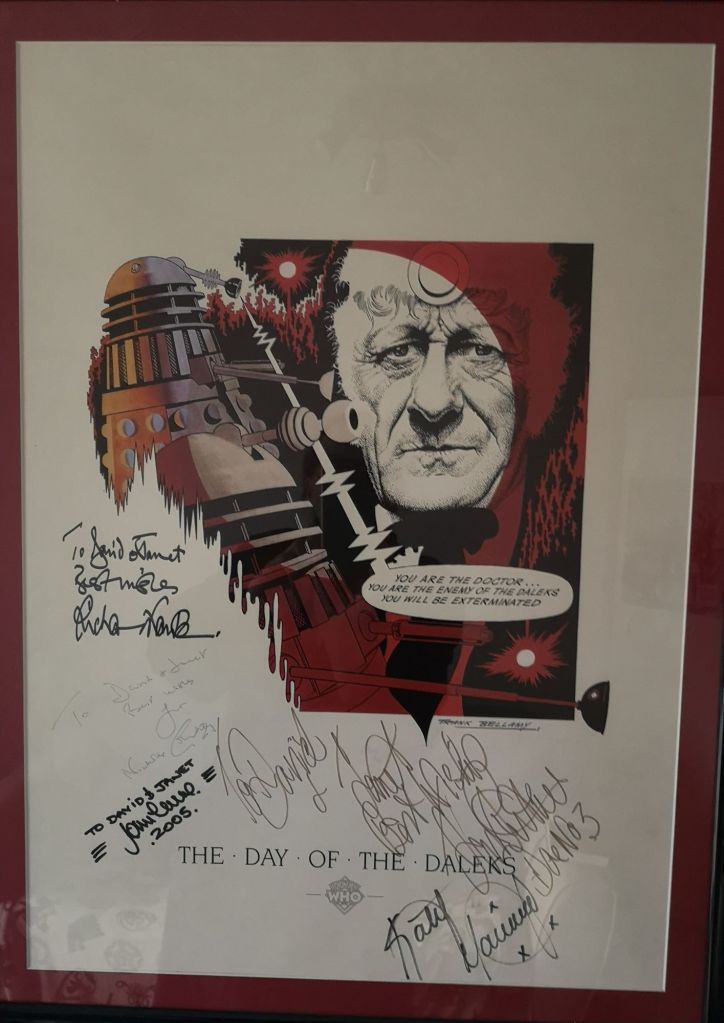 I started at the very top with the Third Doctor himself, Jon Pertwee, who I met backstage at the revival of Scrooge The Musical in 1992. I took a poster along featuring a print of the artwork from the Radio Times cover for Day of the Daleks. Jon signed it and I genuinely thought no more about it. Then I found out that Nicholas Courtney was signing in London in 1995 when I was in the vicinity so I went to a very small convention – they weren’t as well publicised back then – and met him. He was an absolute pleasure to talk to and he too signed my poster. It was then I decided that I wanted all five of the regular cast of the time to sign it.