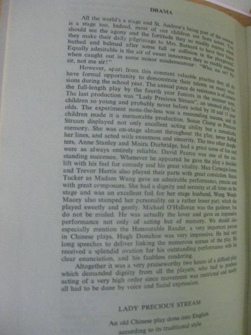 I first got into amateur dramatics in Junior School when our fourth year play took place and I decided to audition for one of the parts in a play called Lady Precious Stream. I got the part of the Prime Minister, one of the main roles, but almost lost it before I got on stage! At the first read through, I hadn’t done more than glance through my part, so not only was I hazy on the speeches, I didn’t know where my cues were! The headmaster Commander Starkie was very angry and said that there would be another read through the following day and anyone who was similarly clueless then would be removed from their role. I was not about to become Spear Carrier Number 1 so I spent the evening poring over the script and practicing for hours until I was happy that I had got it memorised. The following day I was word perfect, and I never put myself into that situation again whenever there was a script to learn. When I got to the two performances I was flying as this review, which I never saw until I revisited the school 35 years later, attests.